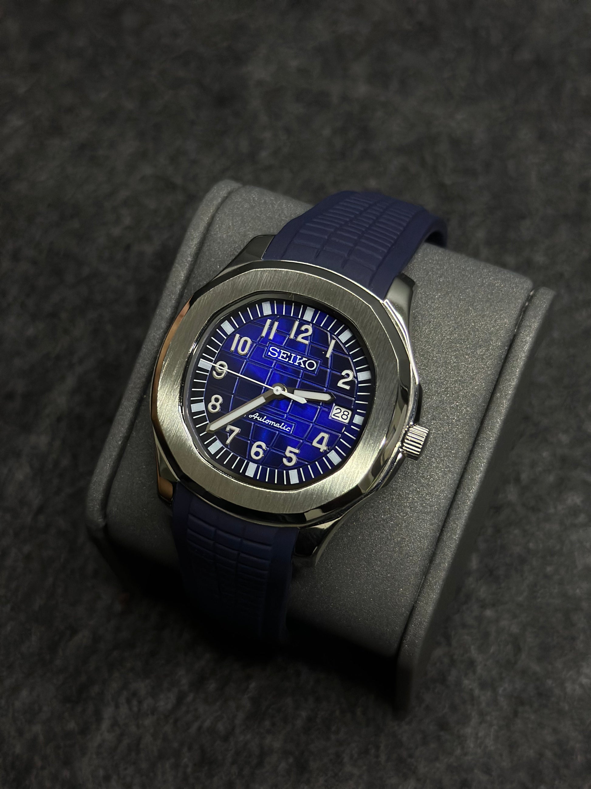 Handcrafted and assembled by our in-house watch experts, the Seiko Aquanaut Mod is powered by the reliable NH35 automatic movement. Drawing inspiration from the iconic Aquanaut design, this mod features the distinctive rounded octagonal case and textured dial, offering a bold yet sporty aesthetic. With its rugged stainless steel case and versatile rubber strap, this watch is designed for those who seek both elegance and adventure.