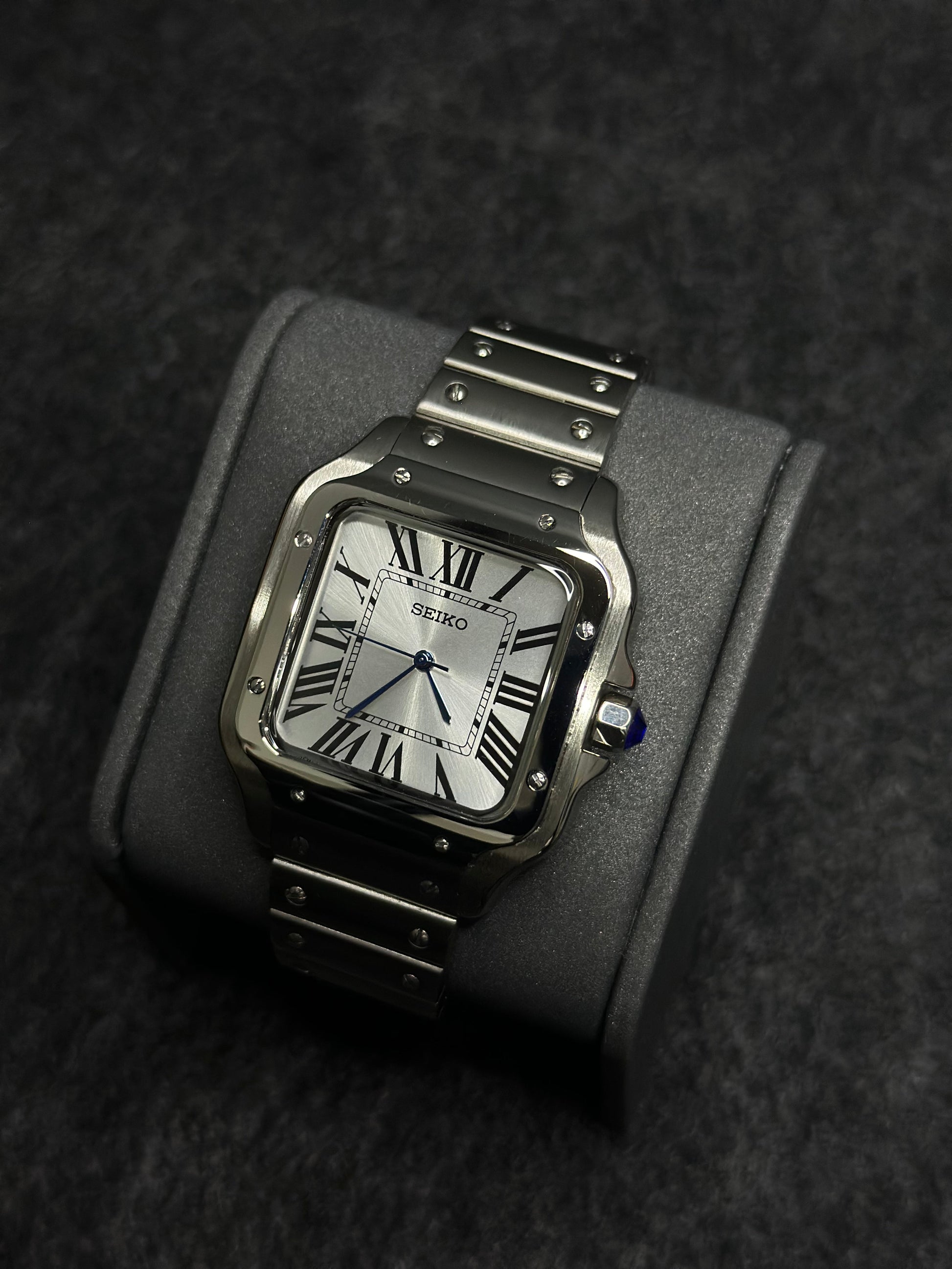Handcrafted and assembled by our in-house watch experts, the Seiko Santos Mod merges Seiko's precision with the timeless square design of the Santos. Featuring bold numerals, a refined stainless steel case, and an NH35 automatic movement, this watch is the perfect blend of classic style and modern functionality.